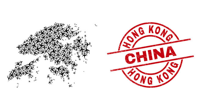 Hong Kong China rubber seal stamp, and Hong Kong map collage of air plane items. Collage Hong Kong map designed of airliners. Red badge with Hong Kong China caption, and scratched rubber texture.