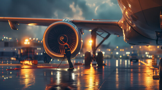 A focused aircraft mechanic inspects airplane, Aircraft Mechanic at Work, avia mechanic