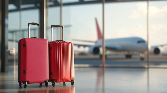 Suitcases at the airport against a window with an airplane in the background. Background with copy space. Travel and air travel