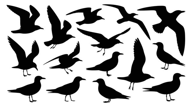 Diverse collection of seagull and gull silhouettes in various flying and standing poses, ideal for marine, coastal, and wildlife design projects