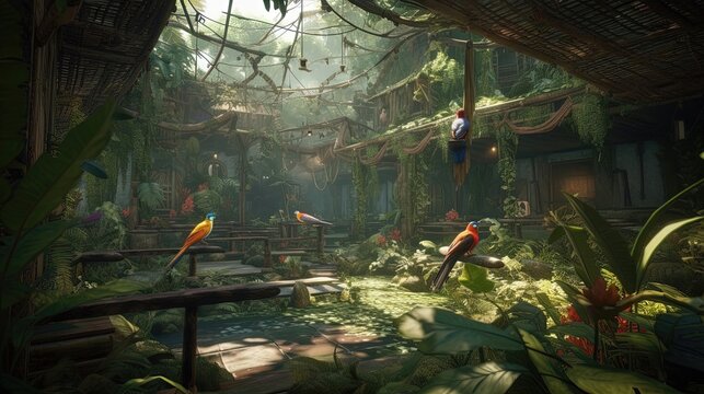 The tropical rainforest aviary with exotic birds is a breathtaking spectacle. Generated by AI.