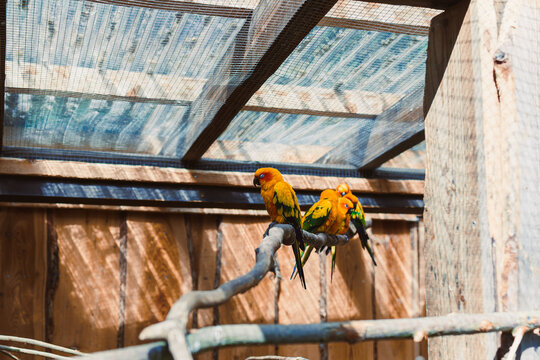 Sun conure parrots in aviary