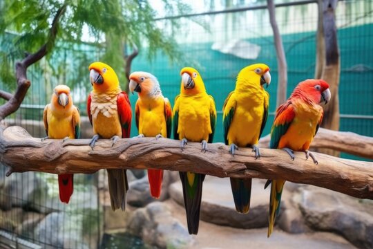 colorful parrots perched on wooden branches in an aviary