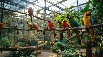 Vibrant tropical birds perched and flying within a lush greenhouse aviary