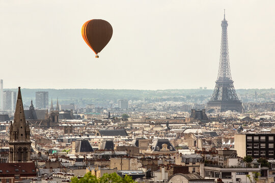 Hot air balloon flying over cityscape with Eiffel Tower in background