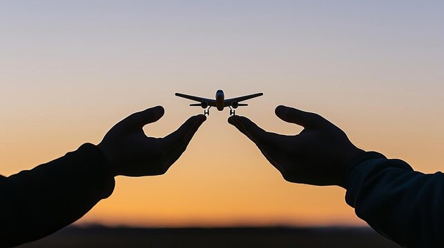 International Civil Aviation Day Silhouettes of hands holding a small airplane model against a clear sky, symbolizing global aviation