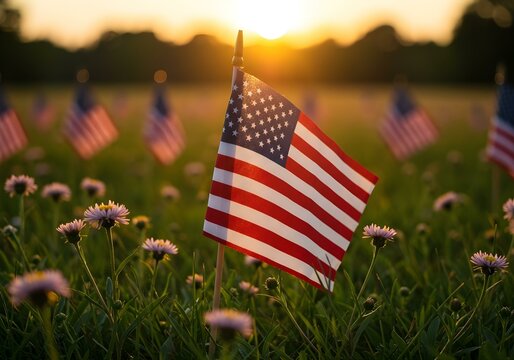 small american flag in blooming flower field at sunset with golden light