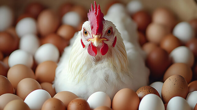 A white hen sits amidst a nest of brown and white eggs, looking directly at the camera.