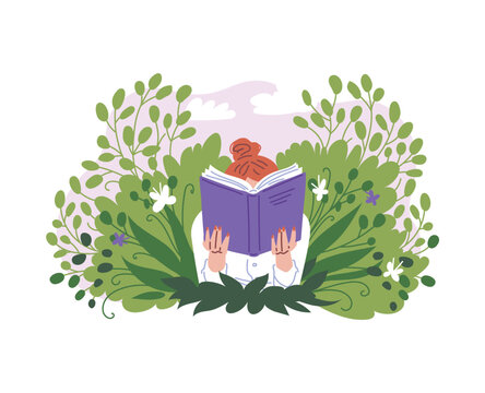 Young woman reading book with enjoy and great interest, vector cartoon female booklover behind a book floral background