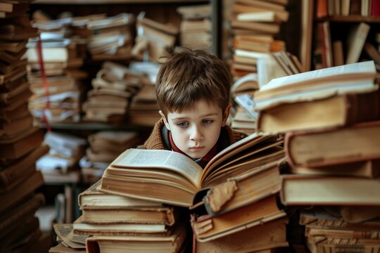 A young boy absorbed in reading a book while sitting in front of a stack of books