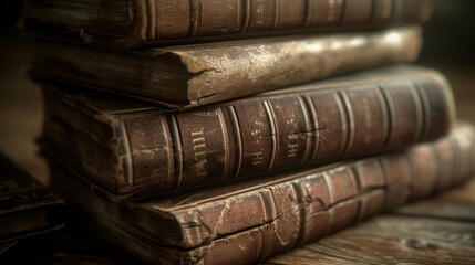 A series of stacked, weathered leather-bound books with cracked spines, revealing years of avid reading