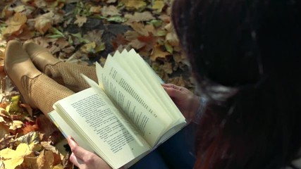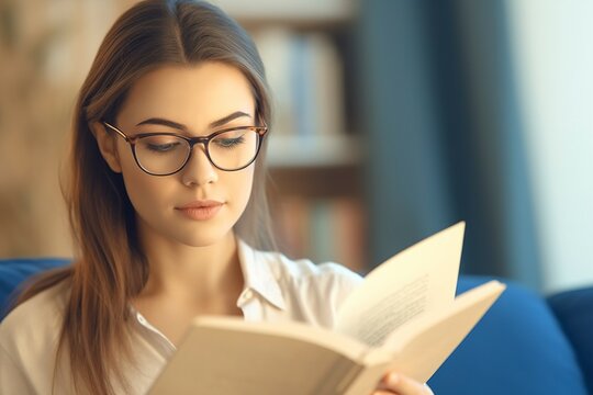A pretty young woman with glasses, an avid reader, bustles over reading a novel. AI generated fictional person.