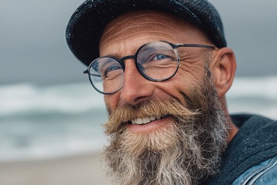 Joyful Bearded Man in Cap and Glasses Enjoying a Day at the Beach: A Close-Up Portrait in Nature