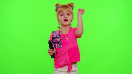 Happy funky young female blogger child kid girl, recording funny dancing video on smartphone for social network or personal channel, having fun entertaining on weekend at home on chroma key background