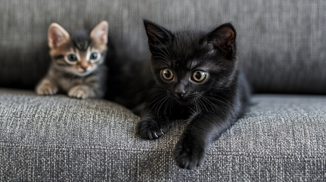 Black cat claws at grey fabric sofa with playful kitten nearby Tips on training your cat to avoid scratching furniture Safeguard your upholstery from feline damage
