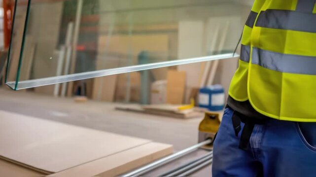 A medium closeup captures the moment a glass panel is gently lowered into place with visible care taken to avoid scratches.