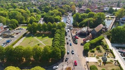Aerial view of traffic flowing on the bridge over the River Avon in Stratford-upon-Avon
