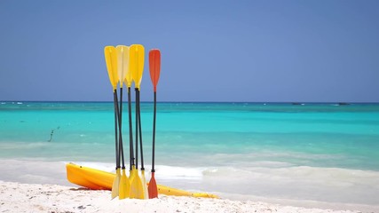 Paddles for surfing in sand on beach. Avtivity sports on caribbean shore