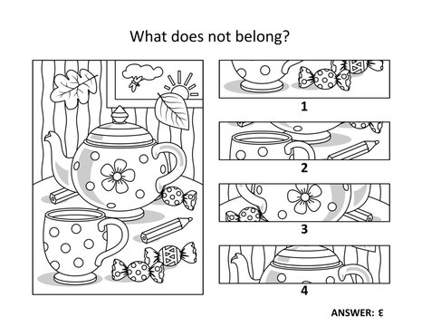 Tea pot, cup, candy, pencils. Visual puzzle or picture riddle: What does not belong? Or, spot the odd one out. Answer included.