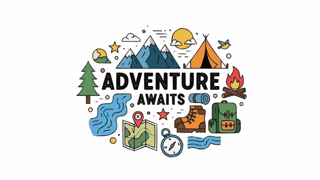 Adventure awaits with camping and hiking elements illustration.