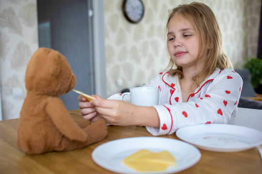 A charming blonde baby in cute pajamas with hearts is eating a delicious breakfast and feeding her beloved teddy bear. The concept of proper and balanced nutrition and games for children.