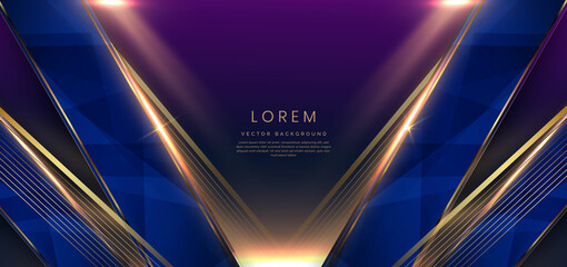 Abstract luxury golden lines diagonal overlapping on dark blue background with lighting effect. Template premium award design.