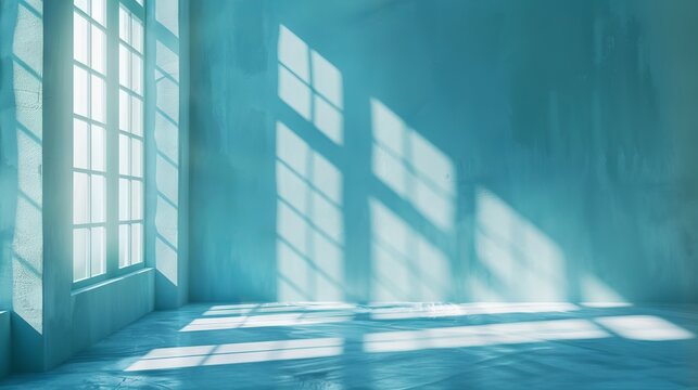 minimal abstract light blue background for product presentation shadow and light from windows on plaster wall