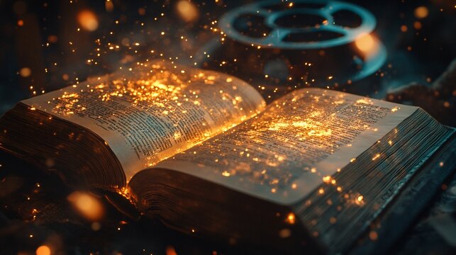A book with a reel of film on top, representing the adaptation of a novel into a film.