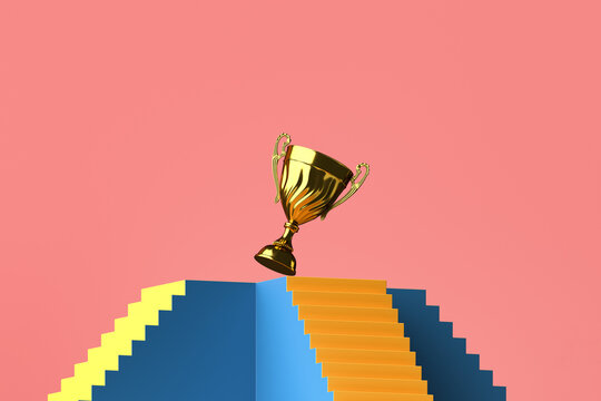 Super Slow Motion. Champion Golden Trophy with Exploding Gold Glitters and Stars against black background. Concept of Success, Victory or Achievement.