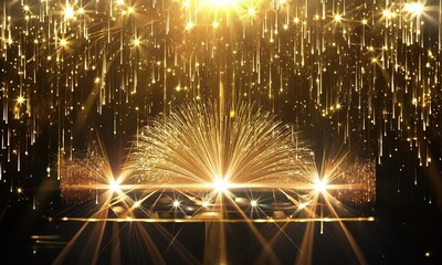 golden confetti shower cascading onto a festive stage, illuminated by a central light beam, mockup for events such as award ceremonies, jubilees, New Year's parties, or product presentations