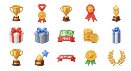 Collection of awards, trophies, medals, ribbons, gift boxes, and coins representing achievement and success
