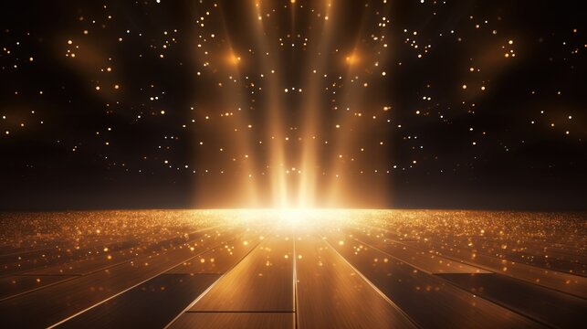 Golden particle neon spot lights flashing, luxury stage background