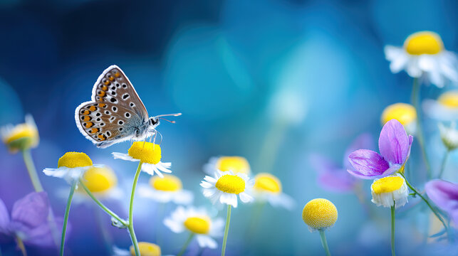 directional. Wildflower meadow with chamomile and purple blooms, butterfly resting on a petal. ESG reports, sustainability campaigns, designed for environmental awareness campaigns.