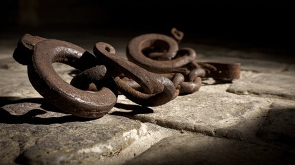 shackles. Rusted iron chains and broken manacles on a stone floor in dim light. public awareness campaigns, NGO reports, designed for public awareness campaigns and NGO communications.