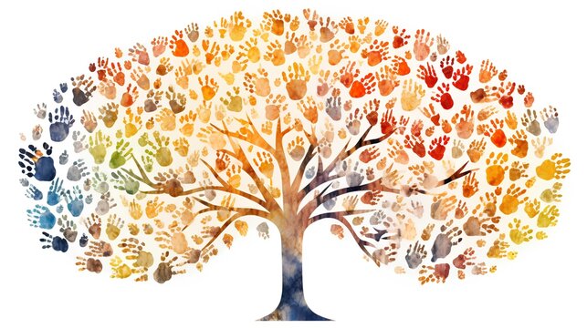 An artistic representation of a tree with branches made from a colorful mosaic of diverse human hands, symbolizing unity in diversity and individual identity.