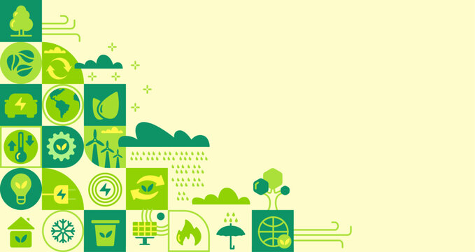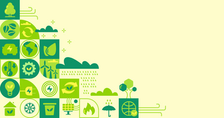 Mosaic eco background. Green abstract geometric pattern with nature icons, modern ecology banner cover for earth day recycling awareness. Vector eco illustration