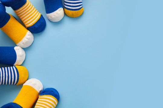 World Down syndrome day background. Down syndrome awareness concept. Socks on blue background