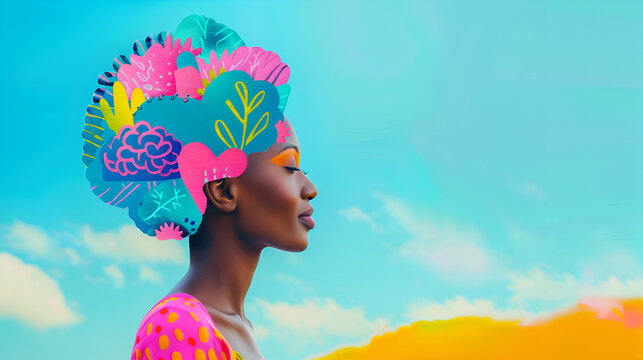 Black Woman's Portrait Showing Colorful Collage Concept of Brain, Positive Thoughts, Emotions and Mental Health Awareness, Inner Strength and Well-Being.