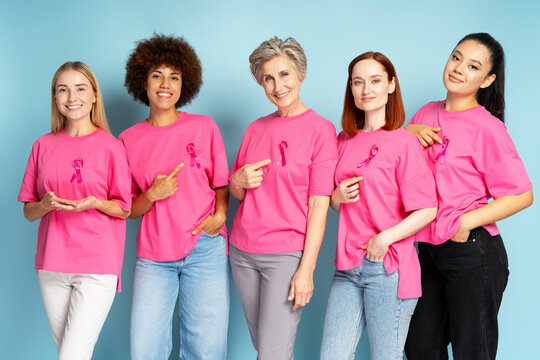 Group of smiling multiracial women wearing t shirts with breast cancer pink ribbon holding hands together isolated on pink background. Health care, support. Breast cancer awareness month concept