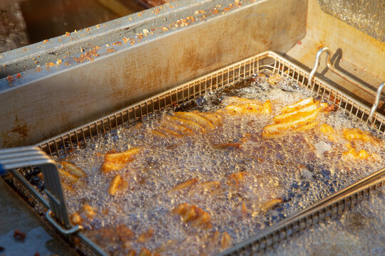 A view of an order of waffle fries boiling away in a deep fryer machine.