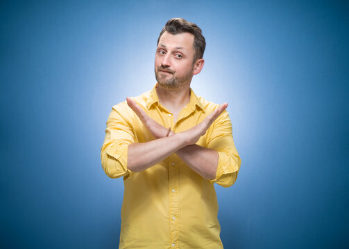 A man showing embarrassment on a light sky blue background, awkward smile, visible sweat detail, expressive realism