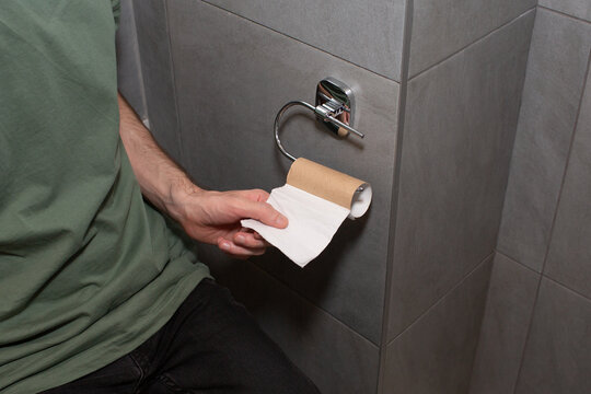 The man takes the last piece of toilet paper. Out of toilet paper. Awkward moment concept.