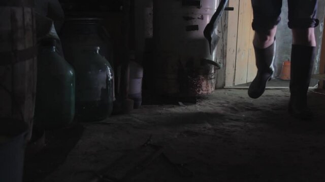 Armed axeman in atmospheric smoke. Dangerous male. Unrecognizable rural man with axe in focus on foreground closeup, spooky atmosphere, danger concept