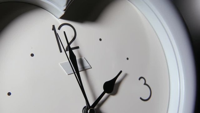 Close up time-lapse metal hands of white clock go forward. wall clock quickly shows time. Indistinguishable time, focus on center of hands.