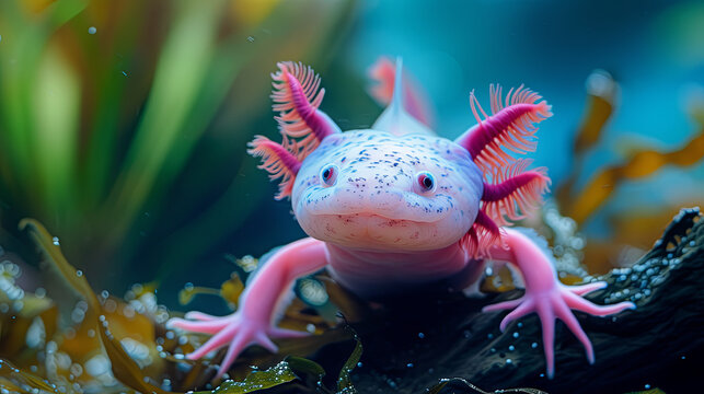 Pink axolotl in a natural planted freshwater tank (ambystoma mexicanum)