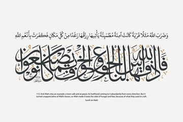 Arabic Quran calligraphy design, Quran - Surah an-Nahl Aya Verse 112. Translation: And Allah cites an example: a town safe and at peace... - Islamic Vector illustration