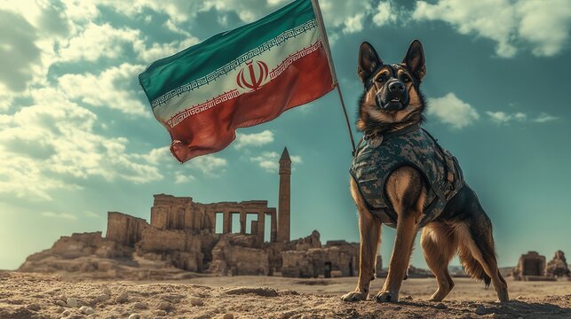 A fearless dog clad in an official Iranian military outfit, raising the Iranian flag high.