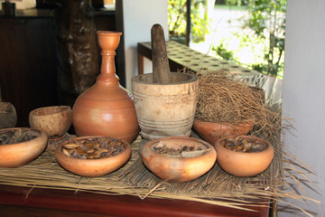 Various spices in clay plate and spoon on concrete background with copy space image encompassing modern apothecary naturopathy and ayurveda concepts