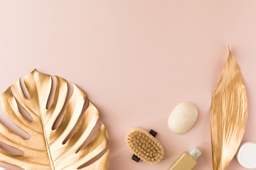 Spa beauty cosmetics on pink table with gold tropical leaves, view from above. Top view, flat lay, Copy space