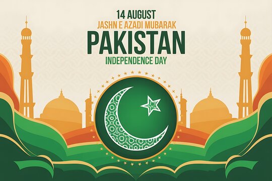 Happy Pakistan Day, Independence Day 14 August 1947. Azadi Mubarak banner, poster, card, template, background with Pakistan map, flag, monuments, and Landmarks Minar e Pakistan, Quaid Tomb, Mosque etc